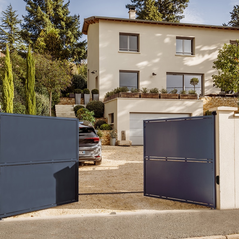 La plupart des portails battants s’ouvrent vers l’intérieur de la maison et peuvent être motorisés avec un moteur Somfy disponible sur la boutique Somfy.